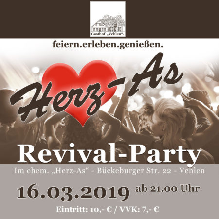 Am 16. März ist es wieder an der Zeit die legendäre Partystimmung von damals aufleben zu lassen. Ehemalige Freunde treffen, die Musik aus der guten alten Zeit in Mark und Bein spüren und in Erinnerungen schwelgen, und das alles am wahren Ort des Geschehens: Im heutigen Gasthof Vehlen (ehemals Herz-As) werden wir für diesen Abend die Zeit zurückdrehen und die unvergessliche Atmosphäre von damals für eine Nacht wieder aufleben lassen.