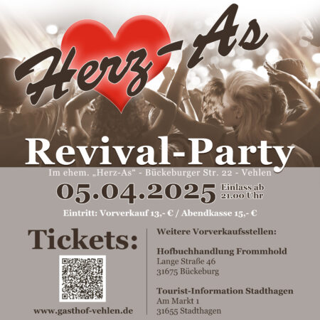 Digitale Tickets für die Herz-As-Revival-Party sind ausschließlich über den Ticketshop auf dieser Seite oder über den QR-Code auf unserer Printwerbung erhältlich.