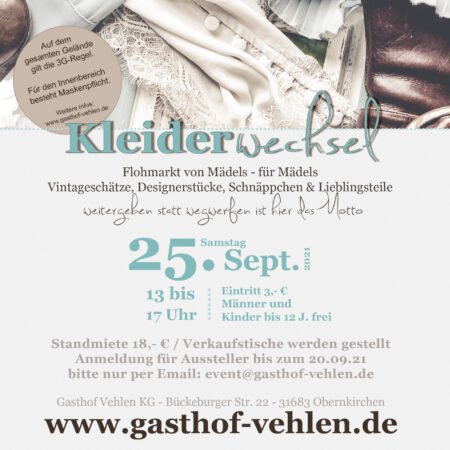 Du hast zu viel Kleidung im Kleiderschrank und verlierst den Überblick? Dann ist der Kleiderwechsel/Mädelsflohmarkt das Richtige für Dich. Hier erwartet dich das etwas andere Flohmarkterlebnis – von Mädels – für Mädels. Neben deinen Kleidungsstücken darfst du natürlich auch Taschen, Accessoires, Schuhe, Gürtel etc. zum Verkauf mitbringen.